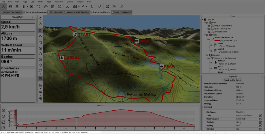 La barre de statut fournit des informations instantanées sur l’élément signalé par la souris (nom de l’emplacement/coordonnées, repère et distance jusqu’à ce point, altitude du point sélectionné...).