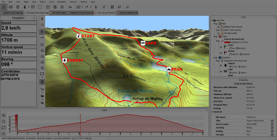 •Fenêtre principale : cette fenêtre de carte permet de gérer et d’éditer des cartes/waypoints/routes/traces/ensembles.