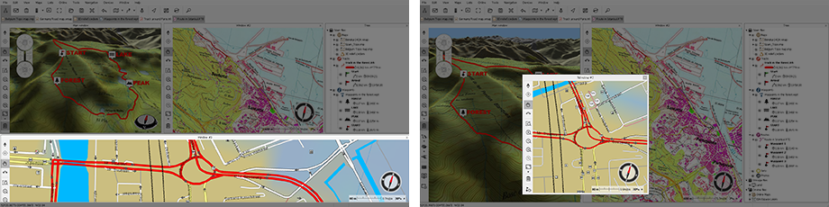 •secondaires : les fenêtres secondaires possèdent les mêmes fonctions que la fenêtre de carte, avec la possibilité de travailler sur différents éléments sans interférer avec le même cadre.