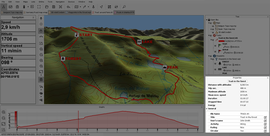 Cette fenêtre est très utile pour vérifier toute sorte de propriétés des cartes/waypoints/routes/traces.