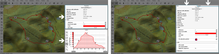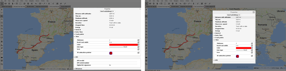 Les propriétés sont classées en catégories et la plupart d’entre elles peuvent être éditées. Il est par exemple possible d’éditer l’épaisseur d’une trace. Le résultat s’affiche automatiquement dans la fenêtre de carte une fois la propriété modifiée.
