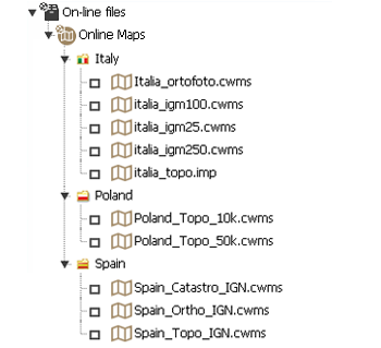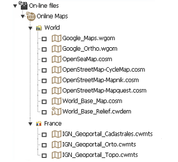 2. Appuyer sur ‘Arborescence des données > Fichiers en ligne’ et sélectionner n'importe quel fournisseur, en fonction de ce que vous souhaitez télécharger. Dans cet espace, vous trouverez différents fournisseurs, la plupart d'entre eux sont des fournisseurs ouverts qui donnent accès à leurs bases de données avec des milliers de cartes disponibles.