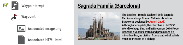 •Ajout de fichiers associés aux waypoints : les waypoints peuvent être associés à des images, des sons, des textes... Les fichiers associés à l’élément peuvent ensuite être affichés depuis l’arborescence des données.