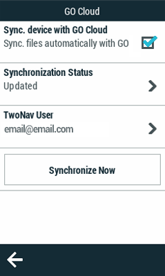 1. Identifiez-vous avec votre compte d'utilisateur TwoNav depuis ‘Menu principal > Configuration > Mes comptes’.