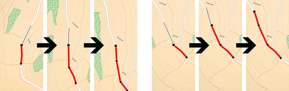 •Recentrage en mode édition : la fenêtre est automatiquement recentrée sur le dernier point en mode édition de nouvelles traces ou routes. Si le mode n'est pas activé, le recentrage de la carte doit être exécuté manuellement lors de l'édition d'éléments.