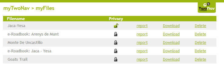MYTWONAV: At the same time that you share the track report with your contacts, the file is also uploaded to myTwoNav (accessible from any computer with internet connection). myTwoNav allows you to manage and store all your tracks as well as check and print track reports, download the files…