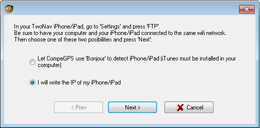 ONLY iPHONE/iPAD DEVICES: Your device can be connected to a computer to send/receive data (waypoints/routes/tracks/maps) via a FTP system. Your device and computer must be connected to the same Wifi network. Follow next steps to connect both devices using Land/Air software:
