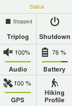 W ‘Menu główne > Status’ możesz sprawdzić aktualny stan wszytskich funkcji aplikacji TwoNav.