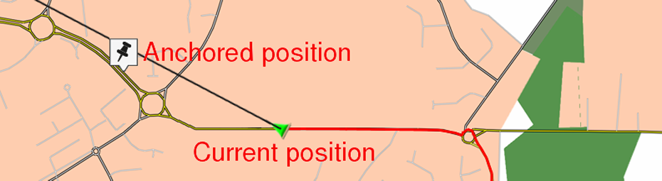 Kiedy pozycja jest ustawiona, informacje wyświetlane na polach danych i tryb ‘Pin’ opierają się na nowym zakotwiczeniu pozycji, a nie na realnej pozycję użytkownika. Co więcej, jeśli opcja ‘Zakotwicz tutaj’ jest przypięta, opcje takie jak ‘Recenter mapy’ są stosowane do zakotwiczonej pozycji a nie aktualnej pozycji użytkownika.