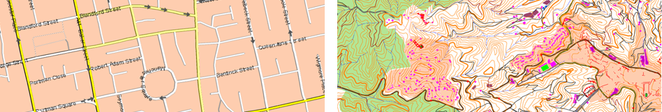 Urbano: Mapas con información referente a carreteras y calles (nombres de calles, sentido vial, puntos de interés...).