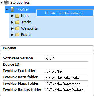 2. Una vez Land/Air haya detectado su dispositivo TwoNav, éste aparecerá listado en el árbol de datos (sección ‘Archivos almacenados’). A continuación, abra el menú contextual en el elemento y seleccione la opción 'Actualizar software TwoNav'.