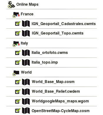 'Contenu internet' ('Menu principal > Fichiers > Contenu internet') vous donne accès à de nombreux fichiers disponibles sur d'autres serveurs Internet. Cette option vous permettra d'accéder facilement à divers contenus en ligne (cartes, traces....).