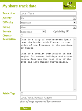 TwoNav vous offre la possibilité de publier facilement vos traces sur Internet et de les partager avec vos contacts au travers des réseaux sociaux:
