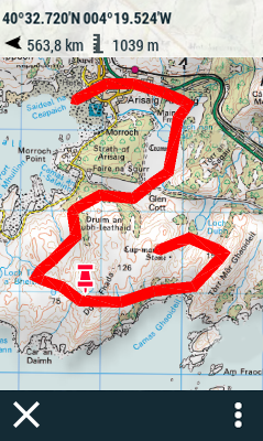 Drücken Sie länger auf eine beliebige Stelle in der Karte, um den ‘Pin’-Modus aufzurufen. Die ausgewählte Position wird markiert, die eingeblendete Oberleiste zeigt Informationen bezüglich des Punktes an (Name des Ortes/Punktes/Koordinaten, Peilung und Distanz zu diesem Punkt, Höhe ü. NN des Punktes).