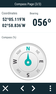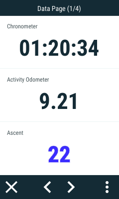 Während der Navigation registriert TwoNav alle Informationen in Echtzeit (Geschwindigkeit, Rhythmus, Höhe, Distanz, Gefälle...). Diese Werte werden Datenfelder genannt und auf Datenseiten gruppiert. Öffnen Sie die TwoNav-Datenseiten, indem Sie auf die Datenleiste klicken. Die Seiten, die während Ihrer Aktivität verfügbar sind, hängen von der Aktivität ab, die Sie zuvor gewählt haben. Diese Seiten bieten einen zusätzlichen Platz auf der Datenleiste, wo Sie eine größere Anzahl von Datenfeldern überprüfen können. Die Datenseiten haben normalerweise 1/8 Felder und sind für die Analyse Ihrer Leistung in Echtzeit sehr nützlich.