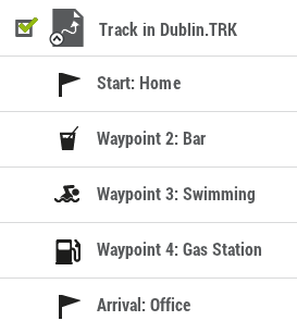 Ein Track ist eine Gruppe von Punkten, die nach Zeit geordnet sind, wobei jeder Punkt Informationen wie Position, Uhrzeit, Datum, und in den meisten Fällen auch die Höhe, enthält.