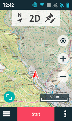 Por defecto, la ventana de mapa muestra el modo 'Sin navegación'. Este modo le proporciona una visión general de su salida, en él podrá iniciar una actividad, ver el recorrido encima del mapa, conocer el estado de la aplicación TwoNav y acceder al menú principal. El modo ‘Sin navegación’ se compone de varios espacios: