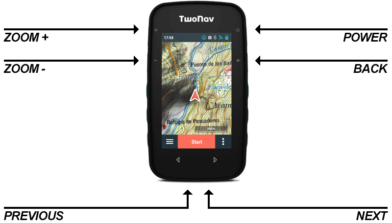 • Pression : 'Retour' dans les menus / 'Recentrage' sur la carte